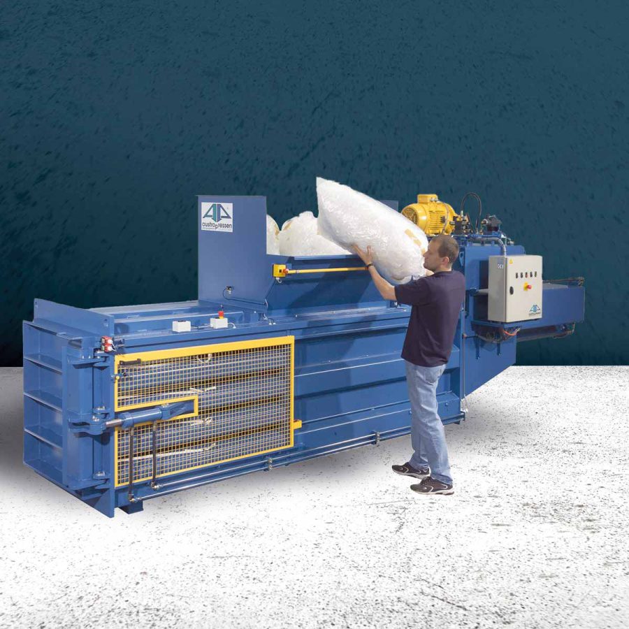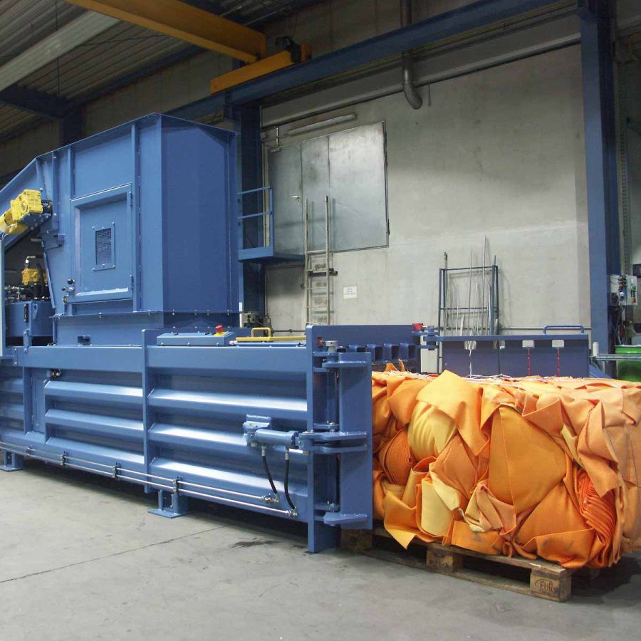 Horizontale Ballenpresse für Kartonagen und Kunststofffolien. Geeignet für die automatische Beschickung dank eines speziellen Schneidsystems. Die hydraulisch verriegelte Tür gewährleistet hohe Ballengewichte und maximale Sicherheit für den Bediener. Vertikale Drahtbindung.